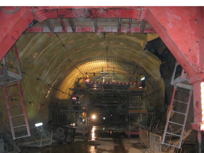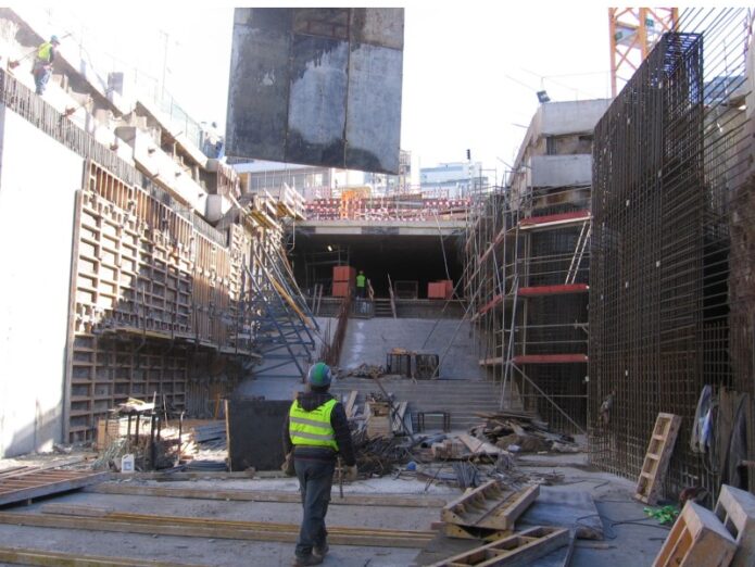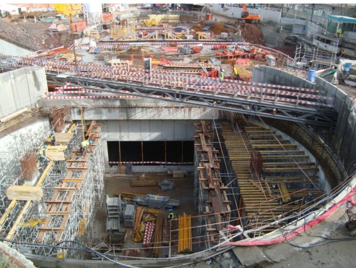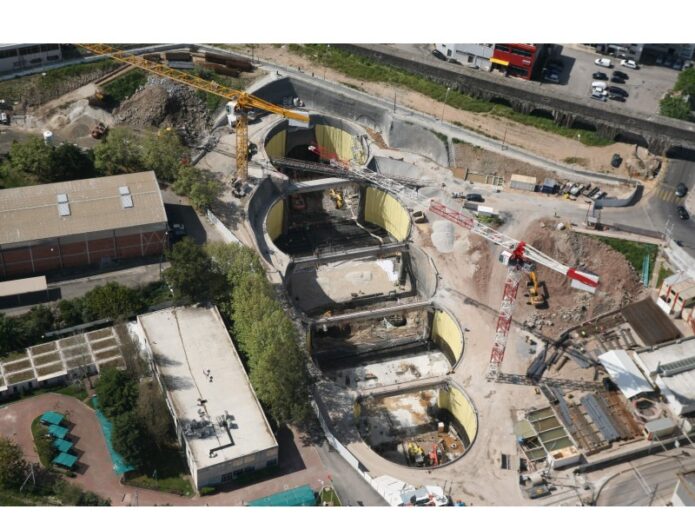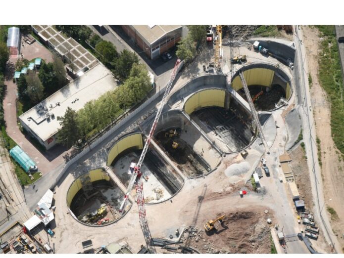 Resumen: Estación excavada en NATM vertical (5 pozos tangentes) con aproximadamente 5 600m2 de área de implantación y cerca de 20m de profundidad.