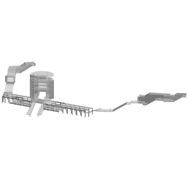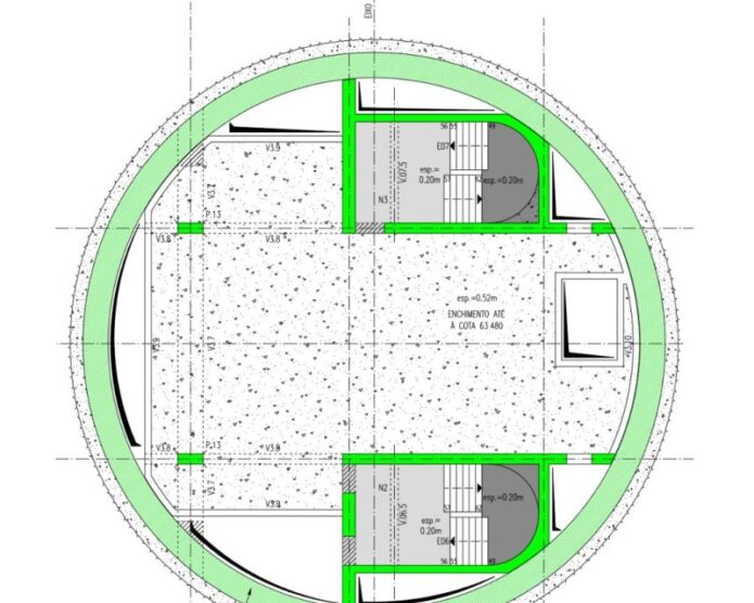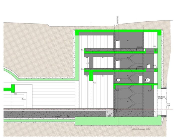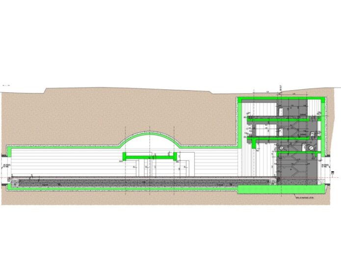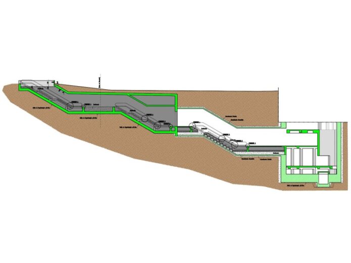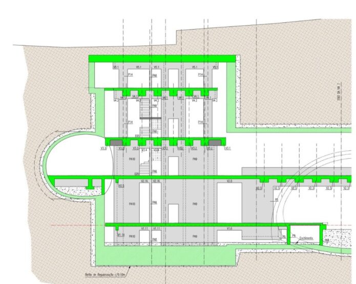 1 puits, qui comprend deux accès d'urgence et 3 étages pour les zones techniques; 1 caverne profonde avec 2 niveaux, traversée au milieu de la mezzanine; 1 puits situé au bout de la caverne du mezzanine dans lequel sont insérés deux étages pour les salles de ventilation; Caverne du mezzanine (orientée à 66 degrés de la précédente à 3 niveaux: fondations, plate-formes et mezzanine), où commencent les galeries d’accès.