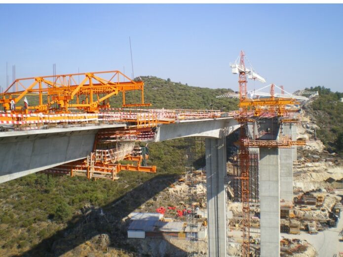 Descrição Sumária: Pórtico com tabuleiro duplo em viga caixão de betão armado pré-esforçado executada por avanços sucessivos.